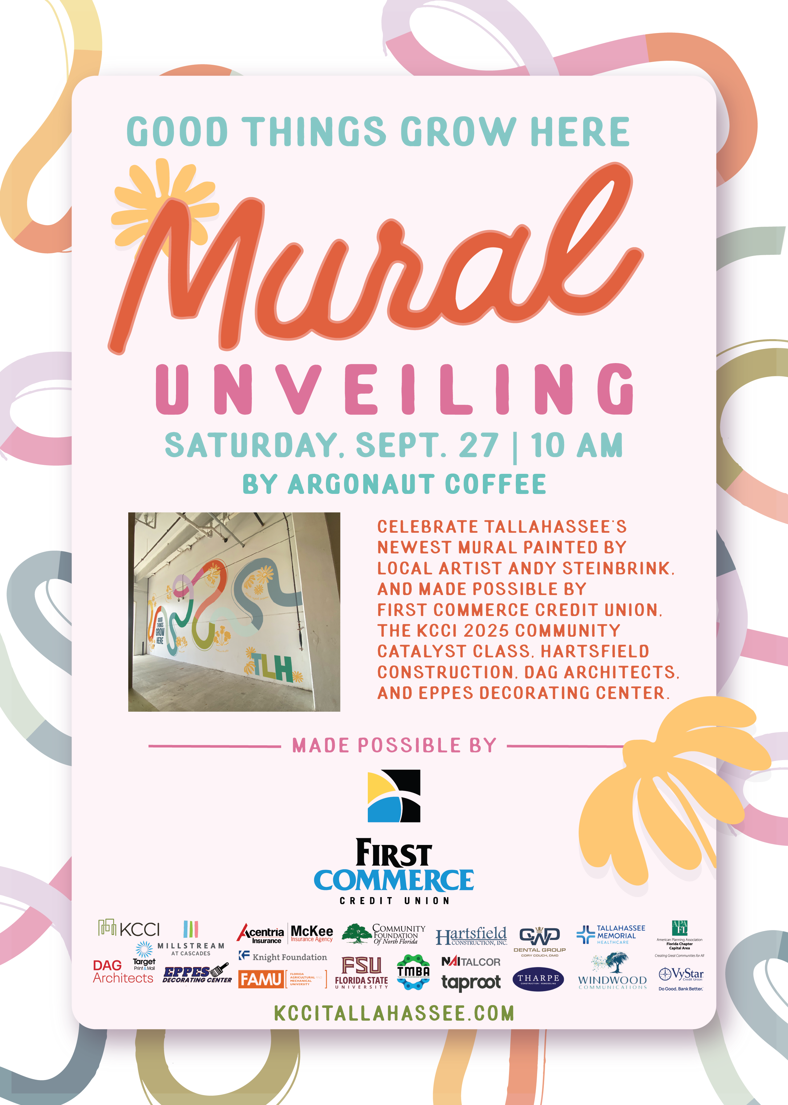 It was a jolly time at the Good Things Grow here mural unveiling. Many came out to celebrate Tallahassee’s newest mural painted by local artist Andy Steinbrink, and made possible by First Commerce Credit Union and the KCCI 2025 Community Catalyst class, Hartsfield Construction, DAG Architects, Eppes Decorating Center, and Becovic Management Group.